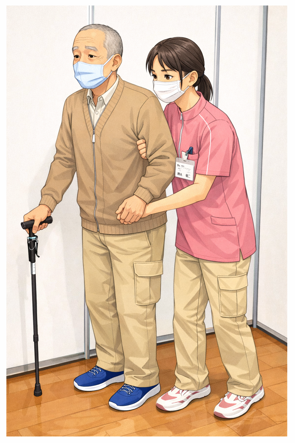 腋窩介助歩行では、原則として患側の斜め後方に立ち、