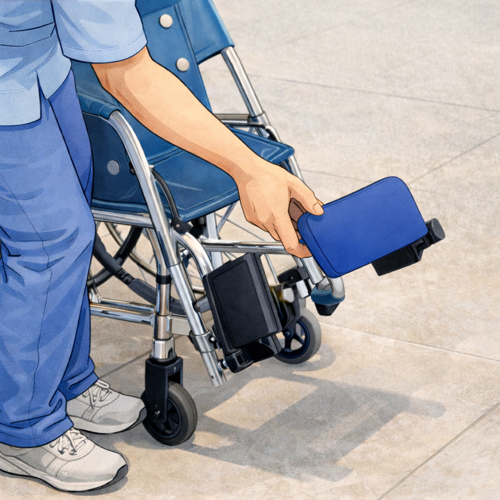 「フットレスト」は足を乗せる部分であり、移乗時の安全確保において極めて重要なパーツです。